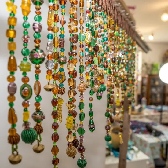 This handmade boho beaded valance features colorful glass beads with brass accents, bells, and tassels for a rich, eclectic look. Designed for doors, windows, or wall décor, it beautifully reflects light and adds artistic charm to any space. Perfect as a room divider or decorative accent, bringing warmth, movement, and bohemian elegance to your home.