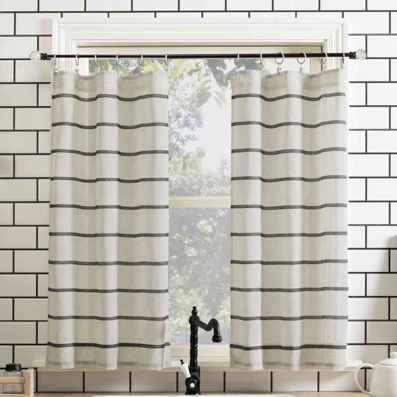 Clean Window Twill Stripe Linen Blend Rod Pocket Kitchen Curtains combine light, airy semi-sheer fabric with a subtle stripe pattern for a fresh, modern look. Made with Endur by Ascend fibers, they repel dust, pet hair, and allergens for a cleaner, healthier home environment. Easy to install on standard rods, these curtains provide gentle light filtering and enhanced privacy for kitchens, bathrooms, or small windows.