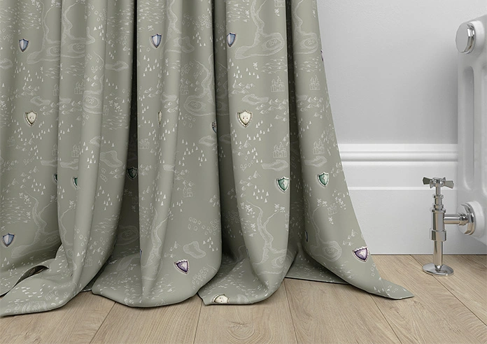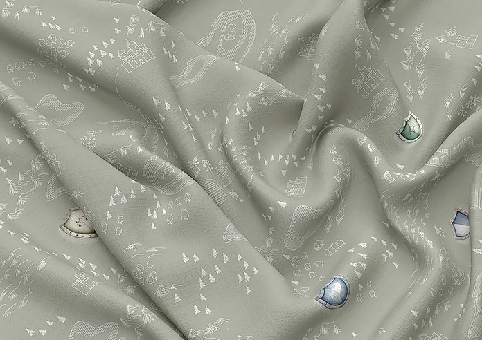Jurassic Joust, Knights Way Templar features watercolour shields inspired by Camelot’s knights on a subtle medieval map background. The khaki base paired with deep green tones creates a refined yet playful look.