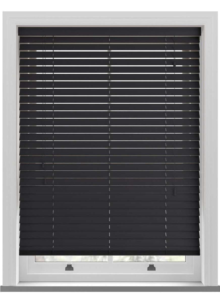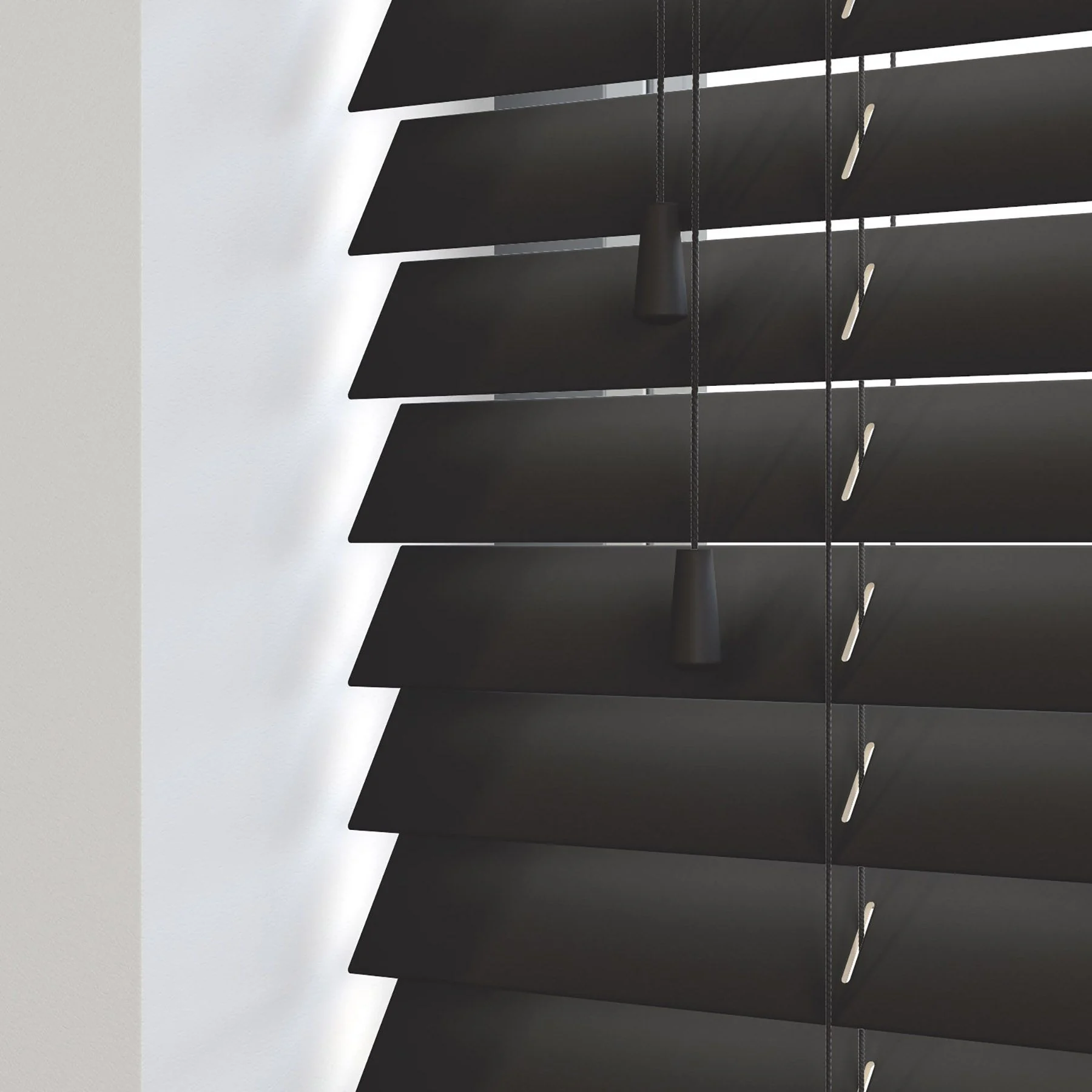 Sleek Premier Mississippi Black wooden blinds bring a bold, luxury look with durable, sustainably sourced basswood construction. Designed with wide 50mm slats and smooth cord controls for precise light and privacy adjustment, plus easy DIY installation. Made-to-measure craftsmanship from our factory in Yorkshire with warranty and customisation options available.