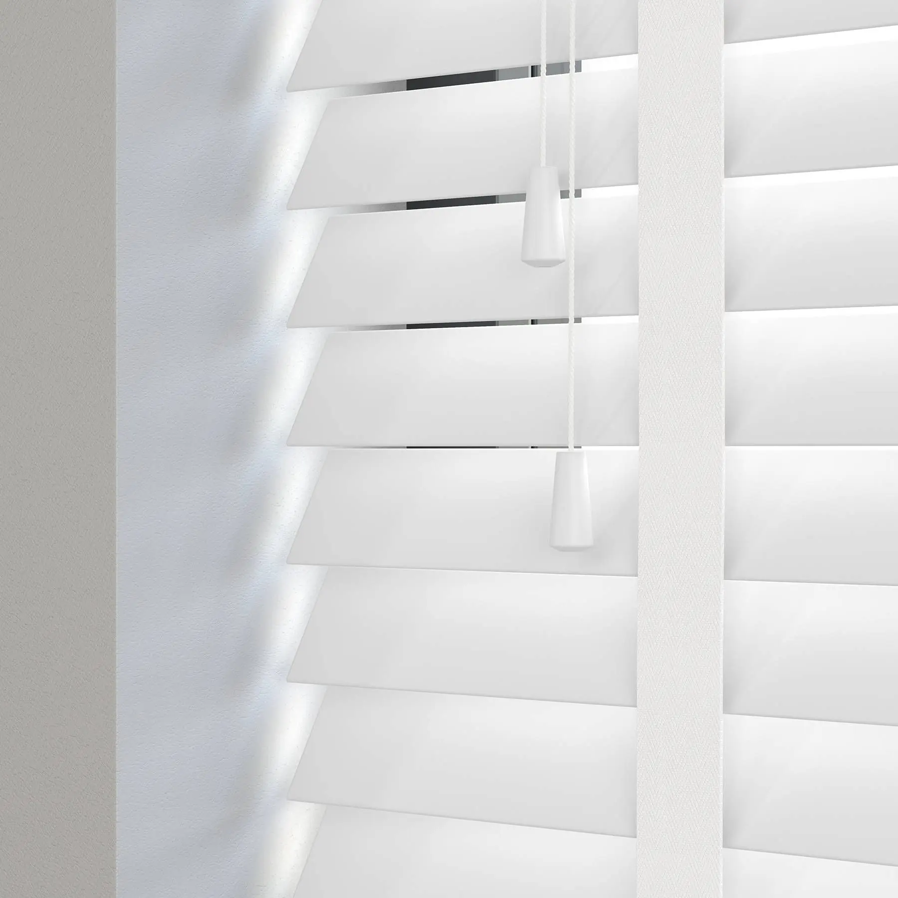 Stylish Premier Taped Bright White Faux Wood Blind offers a clean, modern look at an affordable price.