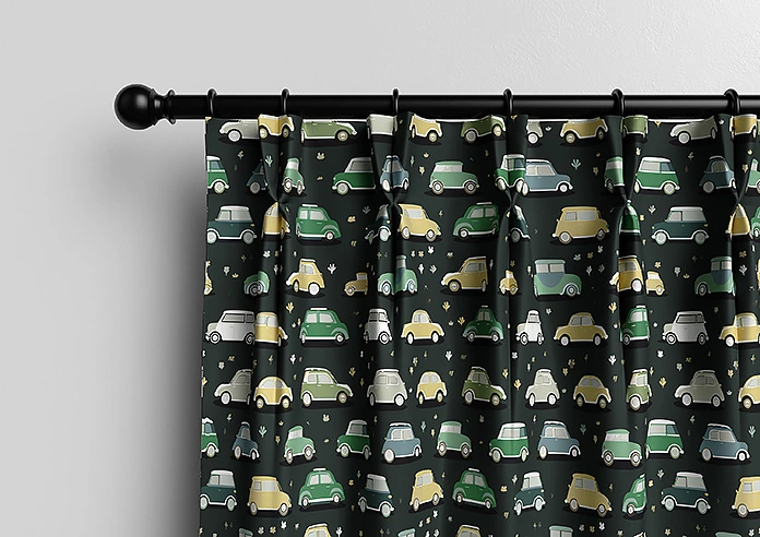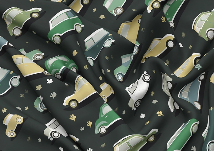 Roadtrip, Forest Green features a playful retro print of vintage cars and simple plant motifs on a rich dark background.Shades of green, yellow and white pop beautifully, creating a fun yet stylish look.