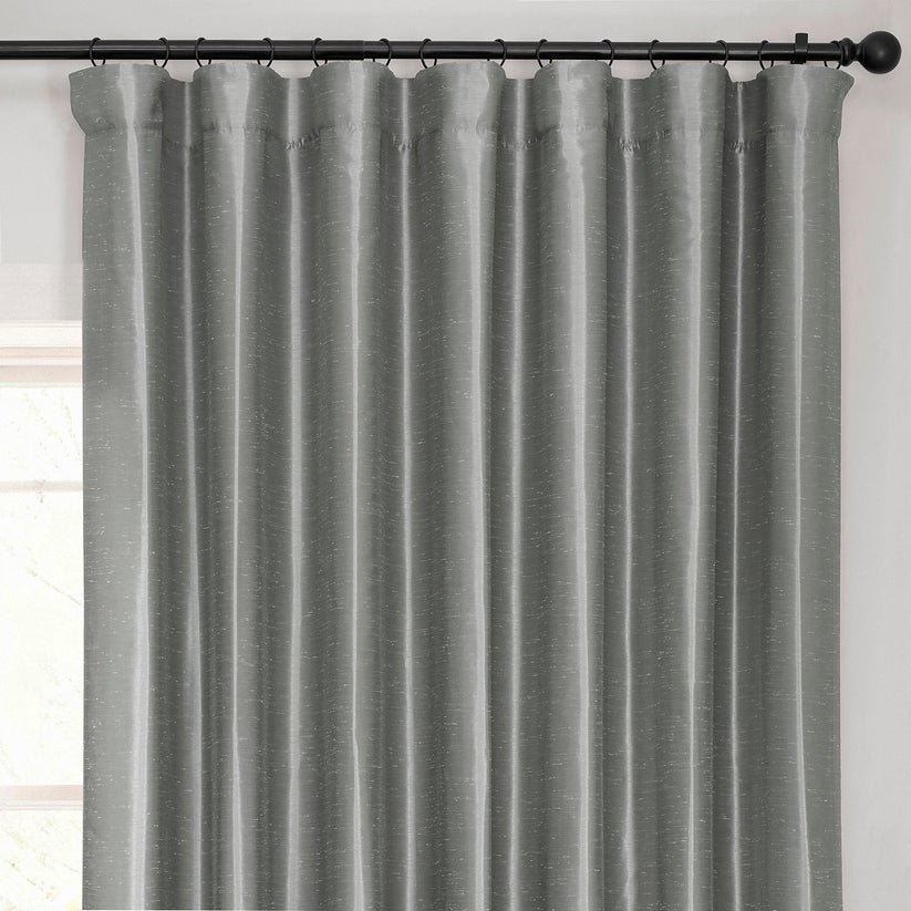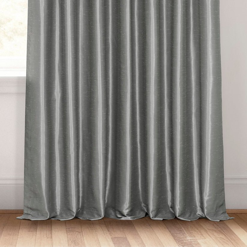 Storm Grey Extra Wide Vintage Textured Faux Dupioni Silk Blackout Curtain features a deep silver-grey hue with subtle slubs, giving an elegant iridescent silk-look finish. Made from 100% polyester with an off-white blackout lining, it blocks 100% of external light for complete privacy and comfort. With versatile hanging options—including rod pocket, back tabs, or rings—this extra-wide curtain panel combines luxury, practicality, and style.